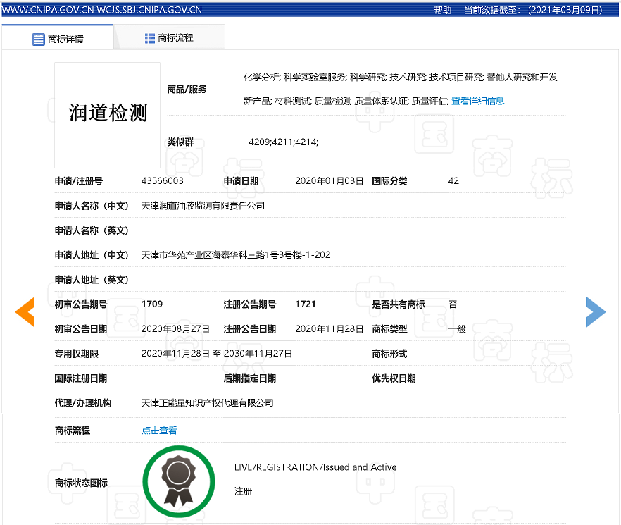 2020年11月28日,国家知识产权局商标局发布公告,公司2020年1月3日申请注册的“润道检测”商标注册成功。国际分类为第42类,商品/服务项目包括化学分析、科学实验室服务、科学研究、技术研究、技术项目研究、替他人研究和开发新产品、材料测试、质量检测、质量体系认证、质量评估等。